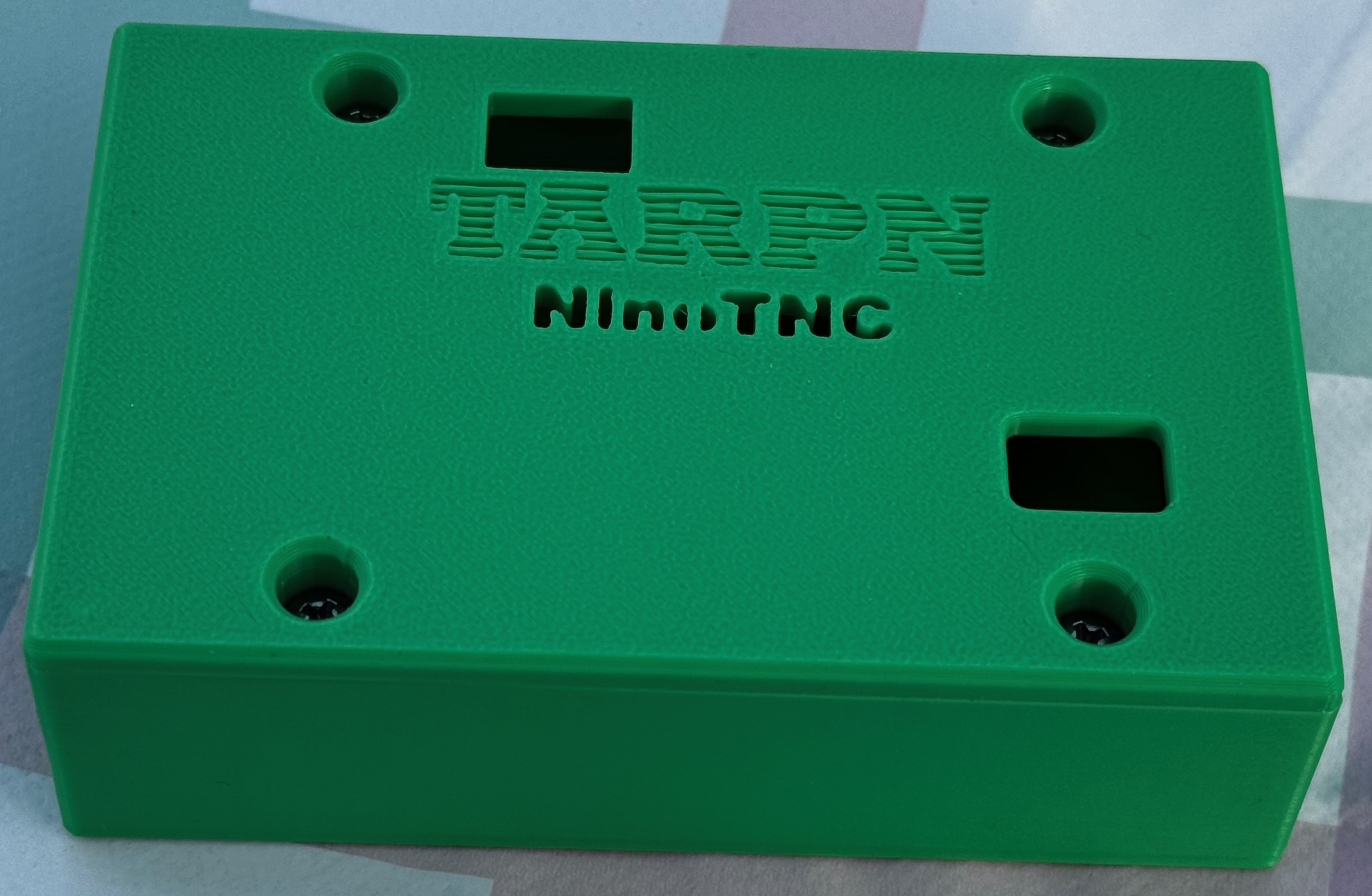 A green 3D printed case for the NinoTNC. Comes in two halves with four screws.